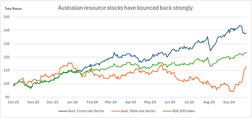 The actions taken by the US Fed and China support the global growth outlook and have provided a welcome boost to commodity prices. Australian resource equities are back in favor, while expensive banks have sold off.