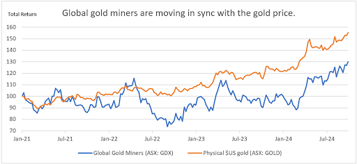 Gold continues to perform strongly, surpassing the US$2,600/oz mark for the first time in September. A lower US interest rate outlook (and a softer US dollar), escalating Middle Eastern conflict and uncertainty over the upcoming US Election have provided support.